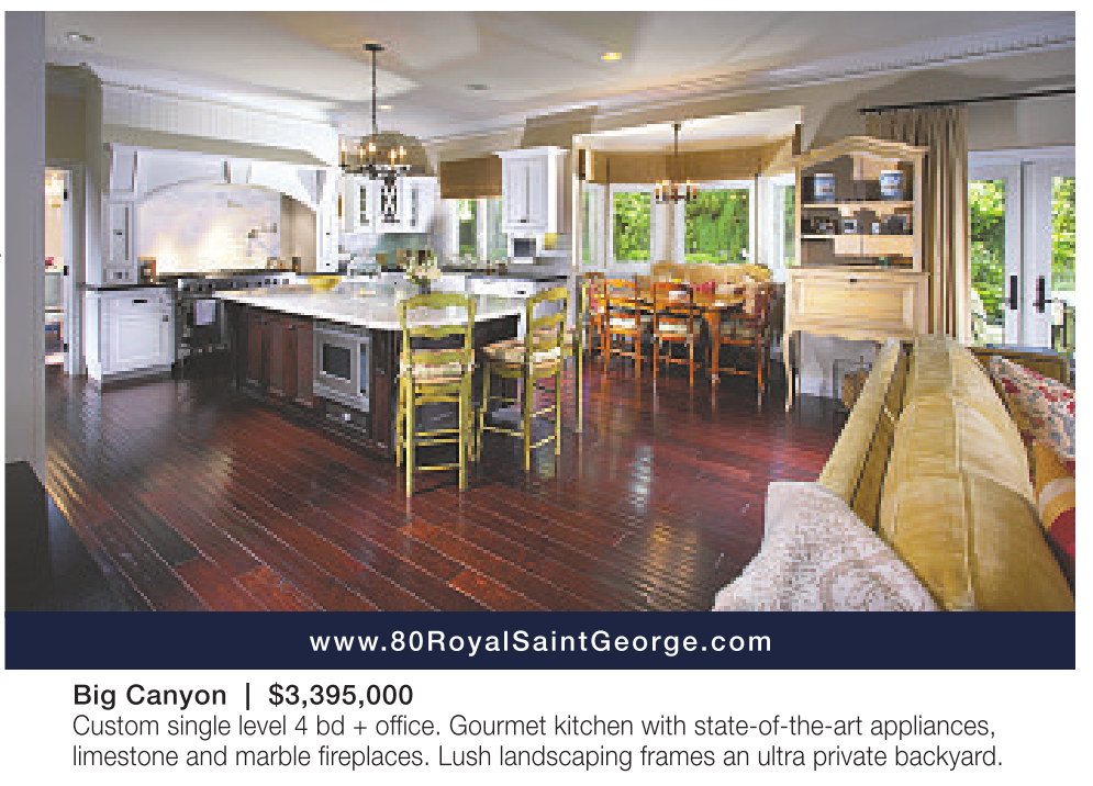 Big Canyon | $3,395,000 Custom single level 4 bd + office. Gourmet kitchen with state-of-the-art appliances, limestone and marble fireplaces. Lush landscaping frames an ultra private backyard.