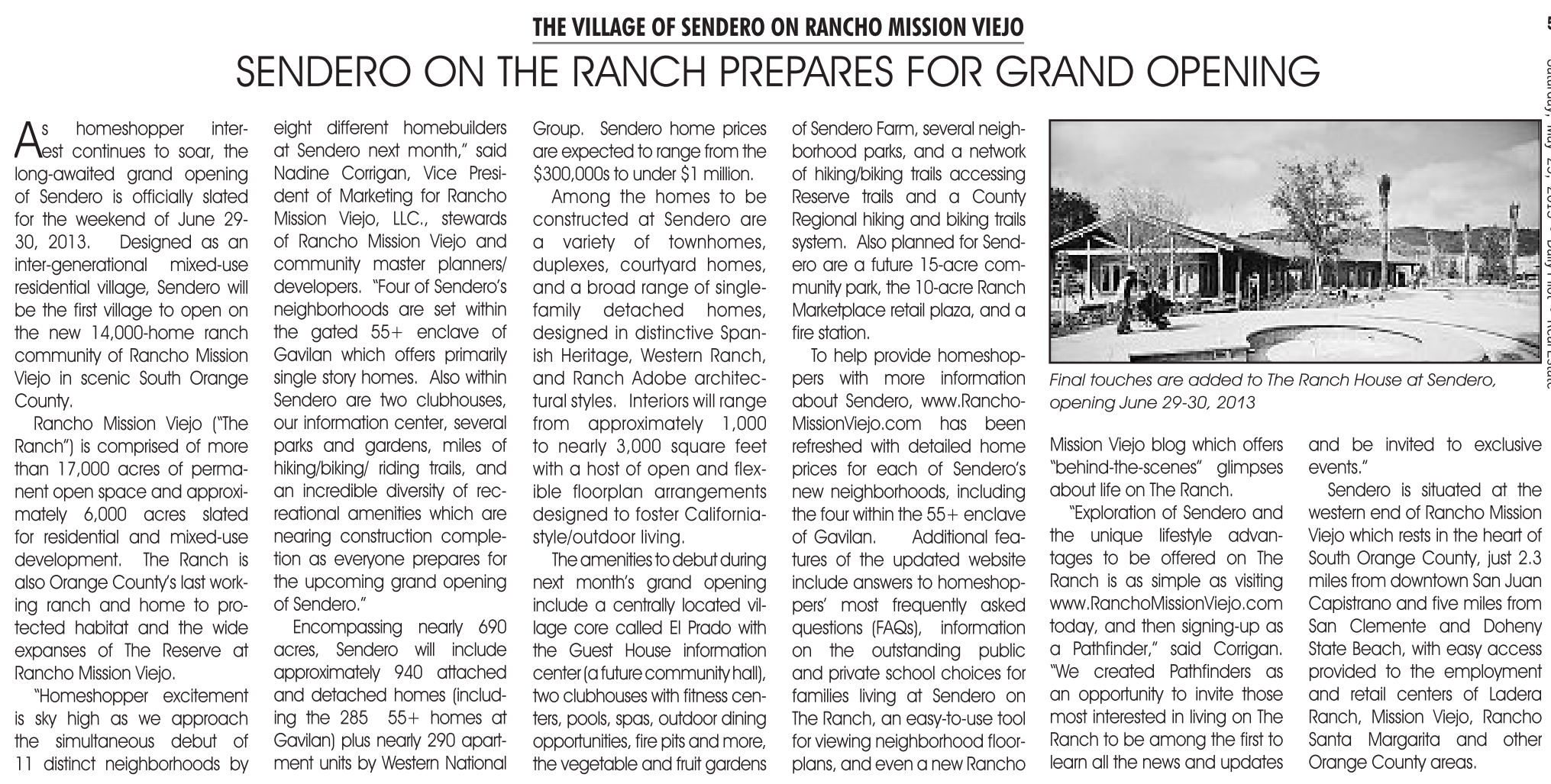 homeshopper interest continues to soar, the long-awaited grand opening of Sendero is officially slated for the weekend of June 29- 30, 2013. Designed as an inter-generational mixed-use residential village, Sendero will be the first village to open on the new 14,000-home ranch community of Rancho Mission Viejo in scenic South Orange County.