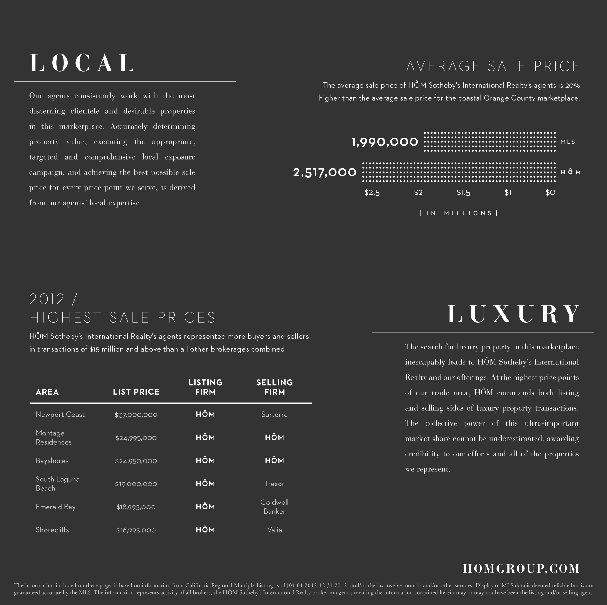 The information included on these pages is based on information from California Regional Multiple Listing as of [01.01.2012-12.31.2012] and/or the last twelve months and/or other sources. Display of MLS data is deemed reliable but is not guaranteed accurate by the MLS. The information represents activity of all brokers, the HÔM Sotheby’s International Realty broker or agent providing the information contained herein may or may not have been the listing and/or selling agent.