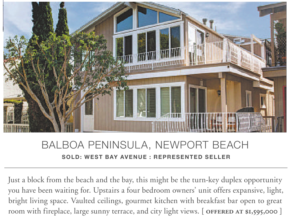 BALBOA PENINSULA, NEWPORT BEACH SOLD: WEST BAY AVENUE : REPRESENTED SELLER Just a block from the beach and the bay, this might be the turn-key duplex opportunity you have been waiting for. Upstairs a four bedroom owners’ unit offers expansive, light, bright living space. Vaulted ceilings, gourmet kitchen with breakfast bar open to great room with fireplace, large sunny terrace, and city light views. [ offered at $1,595,000 ] See also