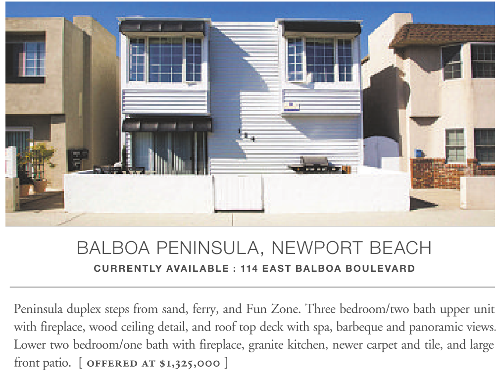 BALBOA PENINSULA, NEWPORT BEACH CURRENTLY AVAILABLE : 114 EAST BALBOA BOULEVARD Peninsula duplex steps from sand, ferry, and Fun Zone. Three bedroom/two bath upper unit with fireplace, wood ceiling detail, and roof top deck with spa, barbeque and panoramic views. Lower two bedroom/one bath with fireplace, granite kitchen, newer carpet and tile, and large front patio. [ offered at $1,325,000 ] See also