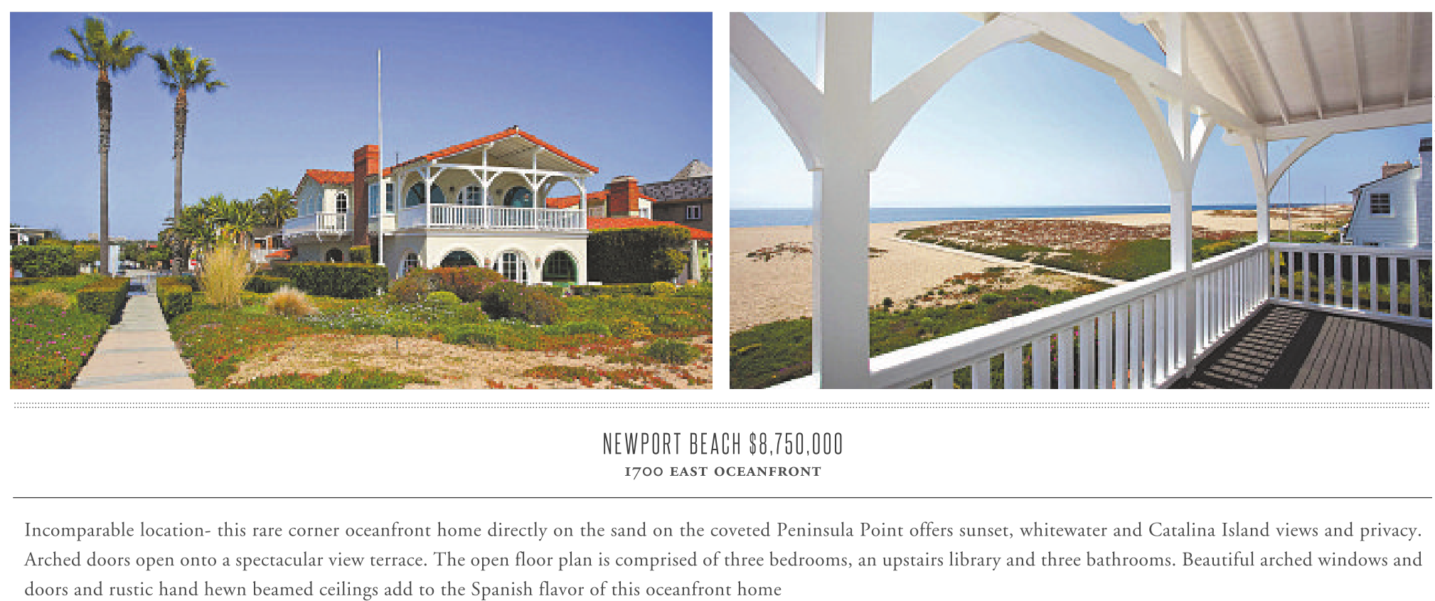 NEWPORT BEACH $8,750,000 1700 east oceanfront Incomparable location- this rare corner oceanfront home directly on the sand on the coveted Peninsula Point offers sunset, whitewater and Catalina Island views and privacy. Arched doors open onto a spectacular view terrace. The open floor plan is comprised of three bedrooms, an upstairs library and three bathrooms. Beautiful arched windows and doors and rustic hand hewn beamed ceilings add to the Spanish flavor of this oceanfront home