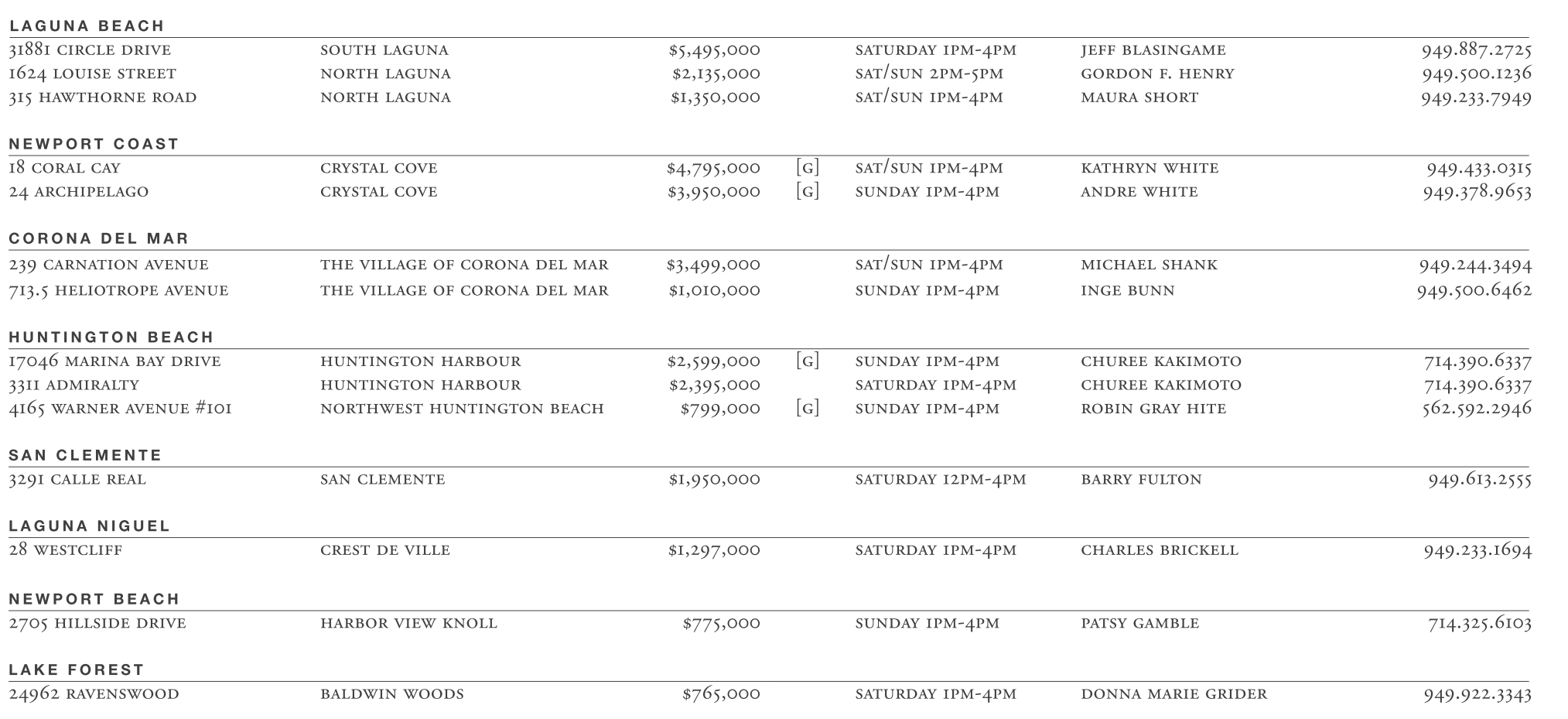 NEWPORT COAST 18 coral cay crystal cove $4,795,000 [g] sat/sun 1pm-4pm kathryn white 949.433.0315 24 archipelago crystal cove $3,950,000 [g] sunday 1pm-4pm andre white 949.378.9653