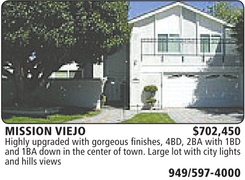 MISSION VIEJO $702,450 Highly upgraded with gorgeous finishes, 4BD, 2BA with 1BD and1BA down in thecenteroftown. Largelot with citylights andhillsviews 949/597-4000