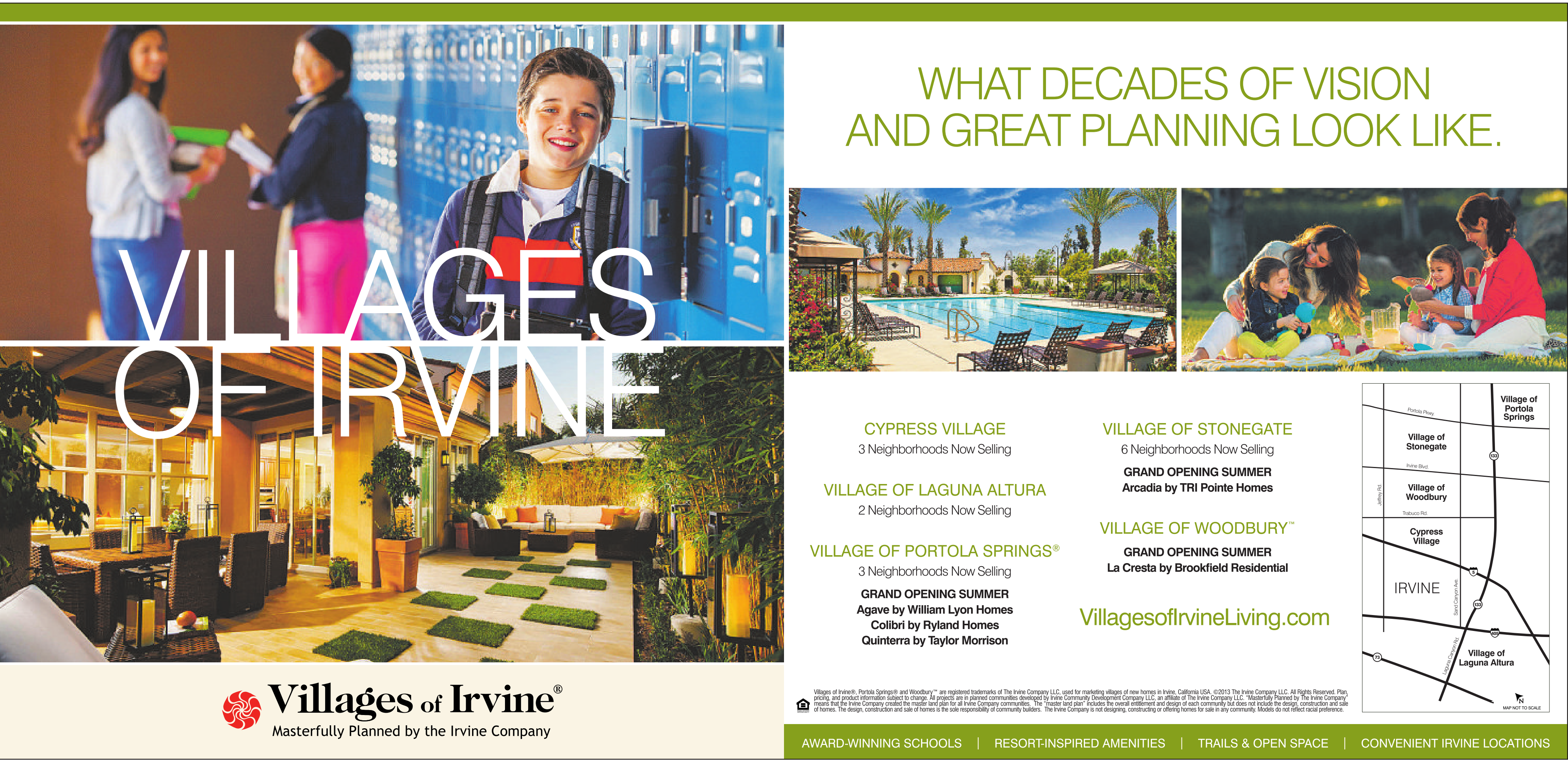 VILLAGES OF IRVINE ® WHAT DECADES OF VISION AND GREAT PLANNING LOOK LIKE. CYPRESS VILLAGE 3 Neighborhoods Now Selling VILLAGE OF LAGUNA ALTURA 2 Neighborhoods Now Selling VILLAGE OF PORTOLA SPRINGS ® 3 Neighborhoods Now Selling GRAND OPENING SUMMER Agave by William Lyon Homes Colibri by Ryland Homes Quinterra by Taylor Morrison VILLAGE OF STONEGATE 6 Neighborhoods Now Selling GRAND OPENING SUMMER Arcadia by TRI Pointe Homes VILLAGE OF WOODBURY ™GRAND OPENING SUMMER La Cresta by Brookfield Residential VillagesofIrvineLiving.com 73 Village of Stonegate Village of Woodbury Trabuco Rd. Cypress Village IRVINE 5133 133 405 Village of Laguna Altura Village of Portola Springs Villages of Irvine®, Portola Springs® and Woodbury™ are registered trademarks of The Irvine Company LLC, used for marketing villages of new homes in Irvine, California USA.©2013 The Irvine Company LLC. All Rights Reserved. Plan, pricing, and product information subject to change. All projects are in planned communities developed by Irvine Community Development Company LLC, an affiliate of The Irvine Company LLC. “Masterfully Planned by The Irvine Company” means that the Irvine Company created the master land plan for all Irvine Company communities. The “master land plan” includes the overall entitlement and design of each community but does not include the design, construction and sale of homes. The design, construction and sale of homes is the sole responsibility of community builders. The Irvine Company is not designing, constructing or offering homes for sale in any community.Models do not reflect racial preference. AWARD-WINNING SCHOOLS | RESORT-INSPIRED AMENITIES | TRAILS & OPEN SPACE | CONVENIENT IRVINE LOCATIONS