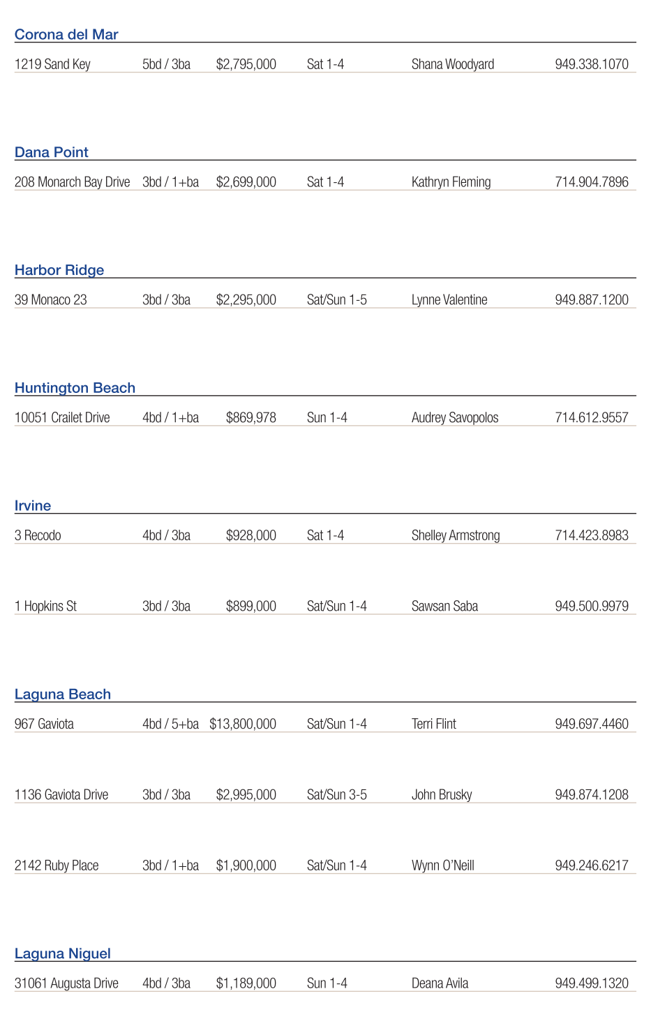 208 Monarch Bay Drive 3bd /1+ba $2,699,000 Sat 1-4 Kathryn Fleming 714.904.7896