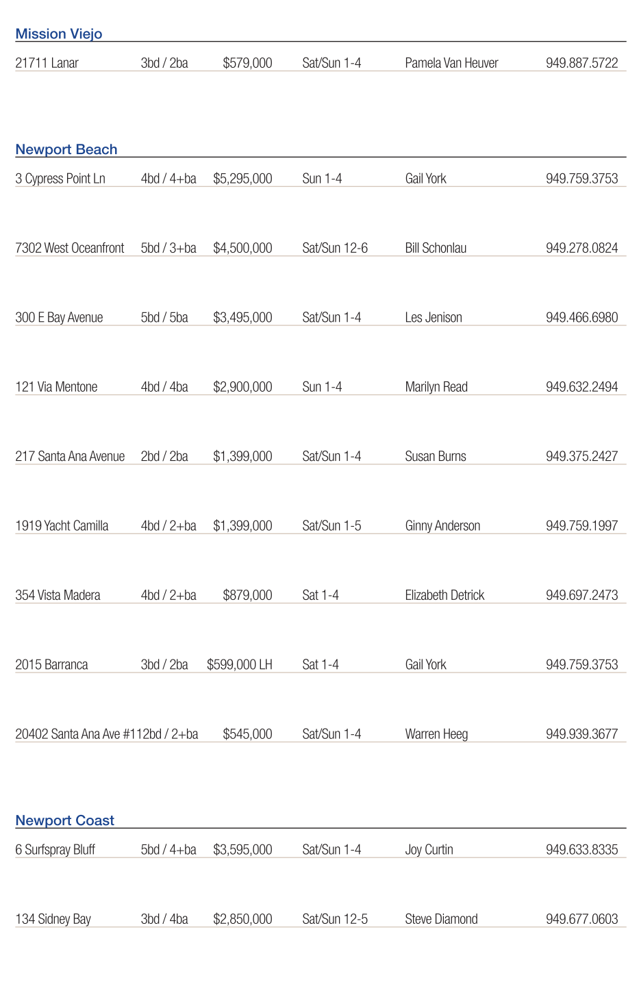354 Vista Madera 4bd /2+ba $879,000 Sat 1-4 Elizabeth Detrick 949.697.2473