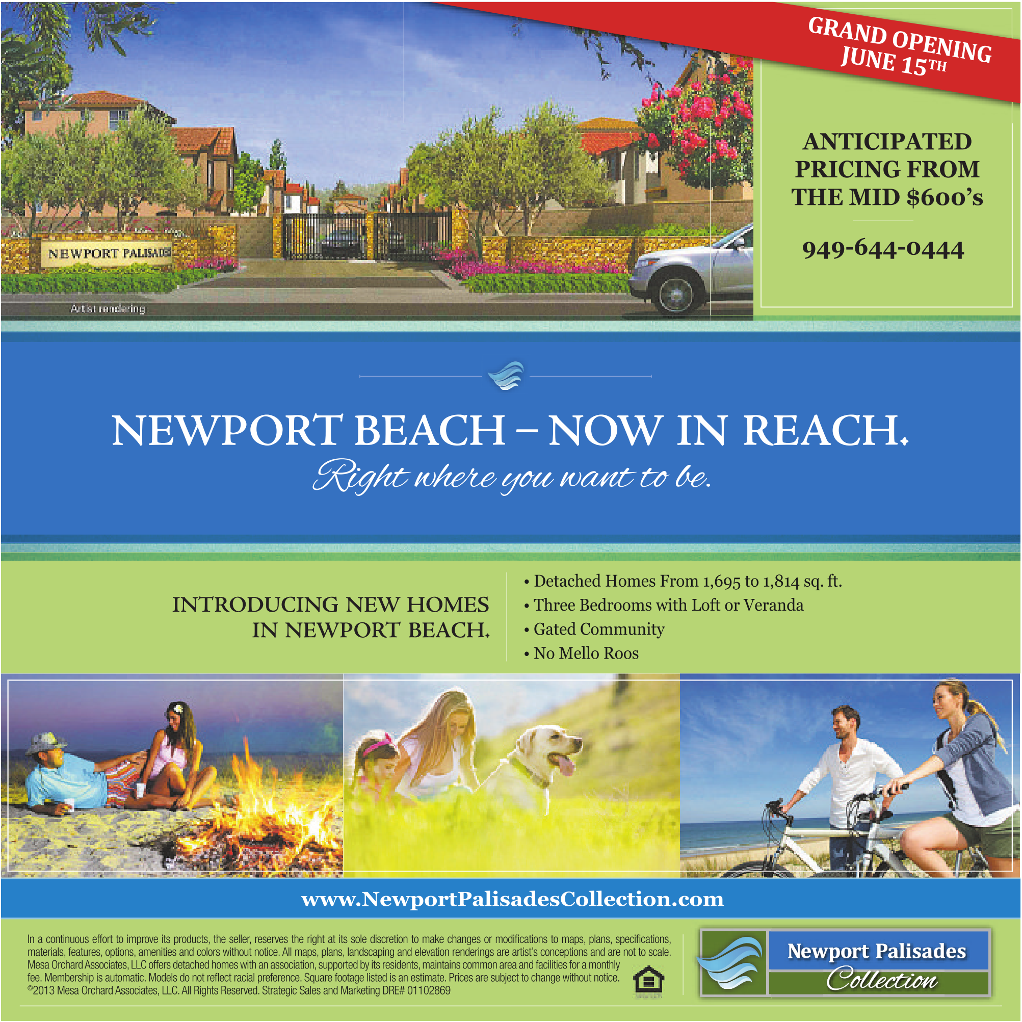 ANTICIPATED PRICING FROM THE MID $600’s 949-644-0444 NEWPORT BEACH – NOW IN REACH. Right where you want to be. INTRODUCING NEW HOMES IN NEWPORT BEACH. www.NewportPalisadesCollection.com In a continuous effort to improve its products, the seller,reserves the right at its sole discretion to make changes or modifications to maps, plans, specifications, materials, features, options, amenities and colors without notice. All maps, plans, landscaping and elevation renderings are artist’sconceptions and are not to scale. Mesa Orchard Associates, LLC offers detached homes with an association, supported by its residents, maintains common area and facilities for amonthly fee. Membership is automatic. Models do not reflect racial preference. Square footage listed is an estimate. Prices are subject to change without notice. © 2013 Mesa Orchard Associates, LLC. All Rights Reserved. Strategic Sales and Marketing DRE# 01102869