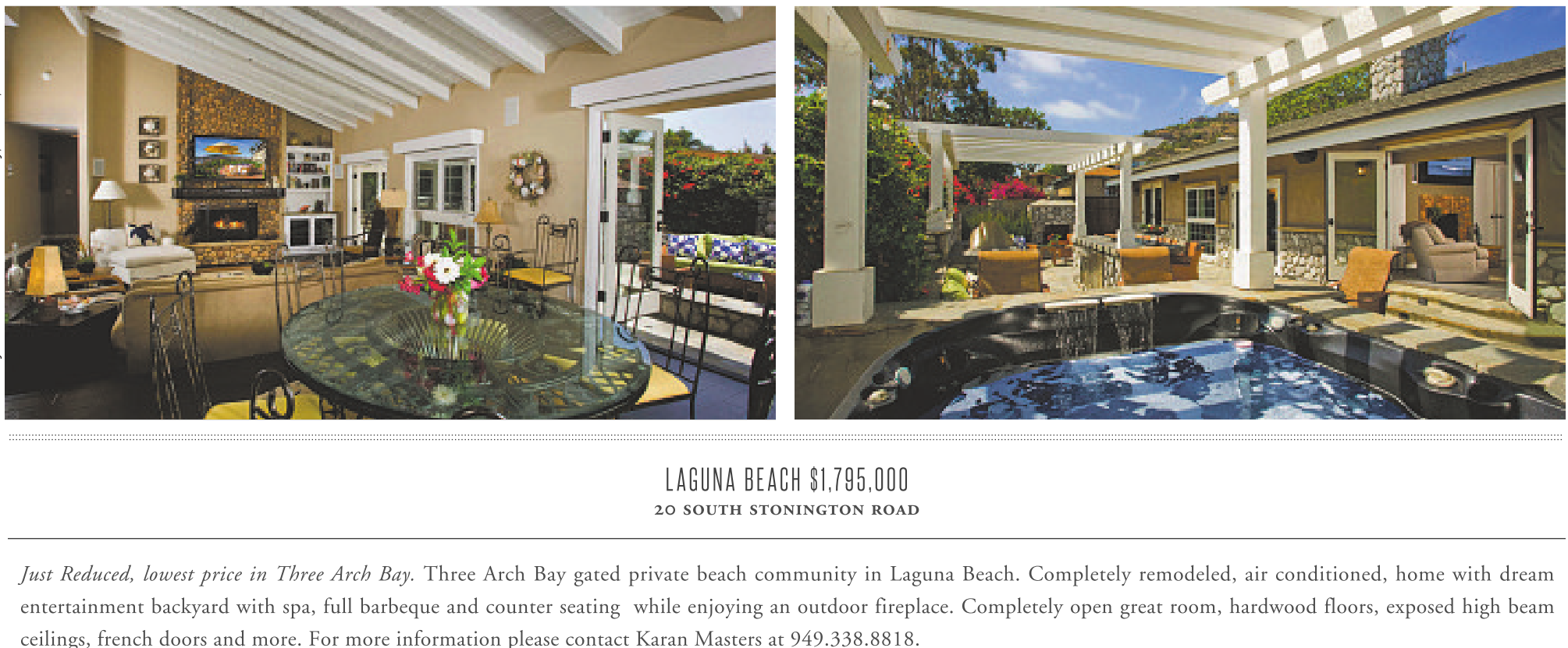 ceilings, french doors and more. For more information please contact Karan Masters at 949.338.8818.
