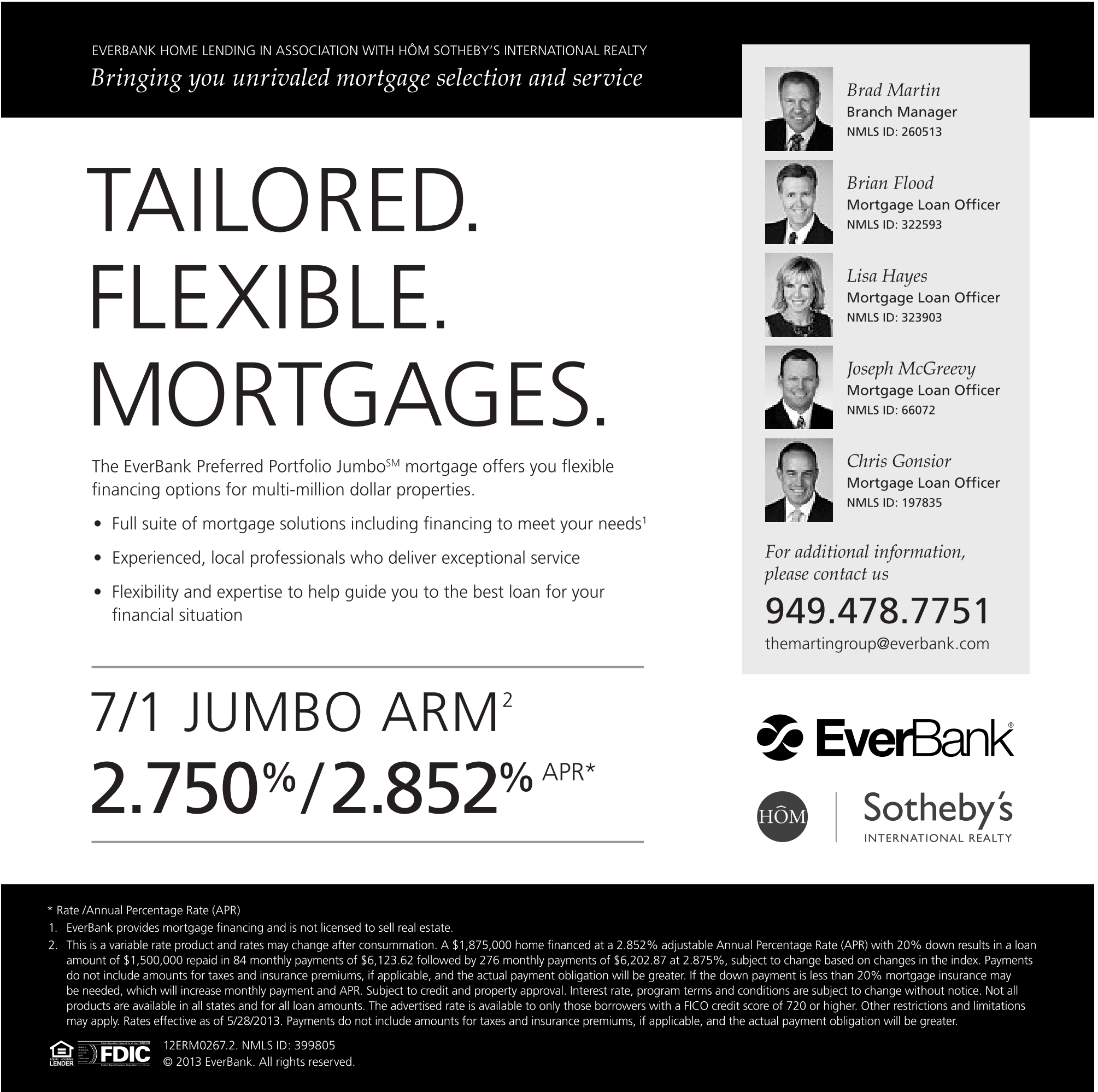 * Rate /Annual Percentage Rate (APR) 1. EverBank provides mortgage financing and is not licensed to sell real estate. 2. this is a variable rate product and rates may change after consummation. A $1,875,000 home financed at a 2.852% adjustable Annual Percentage Rate (APR) with 20% down results in a loan amount of $1,500,000 repaid in 84 monthly payments of $6,123.62 followed by 276 monthly payments of $6,202.87 at 2.875%, subject to change based on changes in the index. Payments do not include amounts for taxes and insurance premiums, if applicable, and the actual payment obligation will be greater. If the down payment is less than 20% mortgage insurance may be needed, which will increase monthly payment and APR. Subject to credit and property approval. Interest rate, program terms and conditions are subject to change without notice. Not all products are available in all states and for all loan amounts. the advertised rate is available to only those borrowers with a FIco credit score of 720 or higher. other restrictions and limitations may apply. Rates effective as of 5/28/2013. Payments do not include amounts for taxes and insurance premiums, if applicable, and the actual payment obligation will be greater.