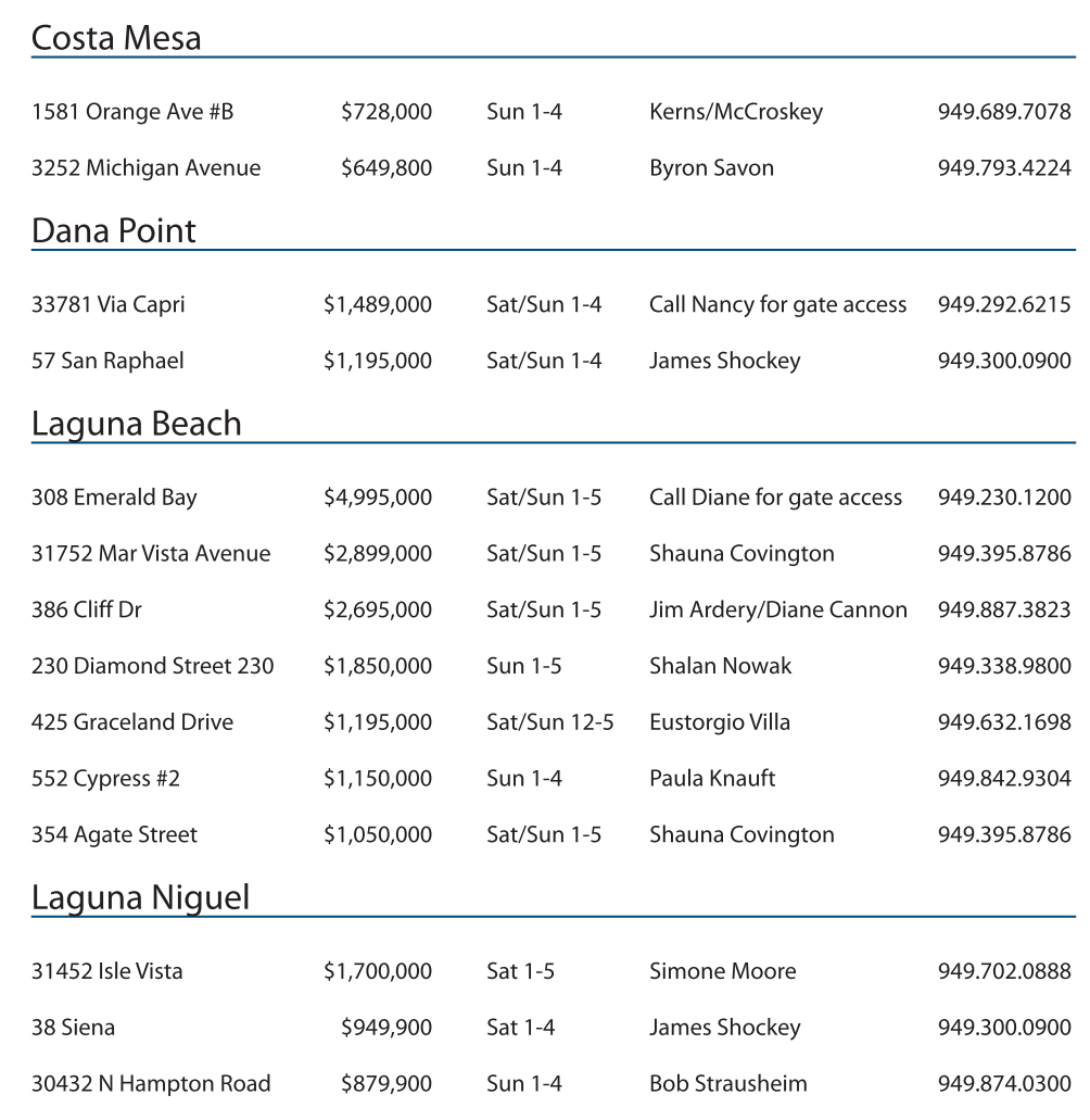 386 Cliff Dr $2,695,000 Sat/Sun 1-5 Jim Ardery/Diane Cannon 949.887.3823