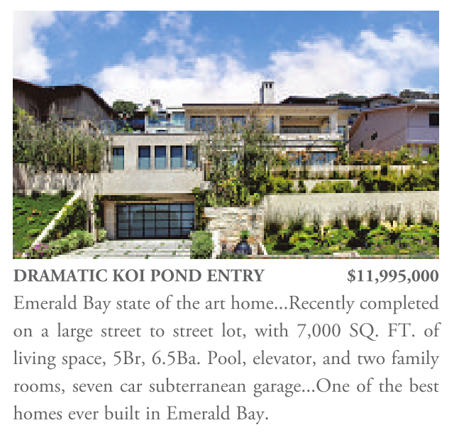DRAMATIC KOI POND ENTRY $11,995,000 Emerald Bay state of the art home...Recently completed on a large street to street lot, with 7,000 SQ. FT. of living space, 5Br, 6.5Ba. Pool, elevator, and two family rooms, seven car subterranean garage...One of the best homes ever built in Emerald Bay.
