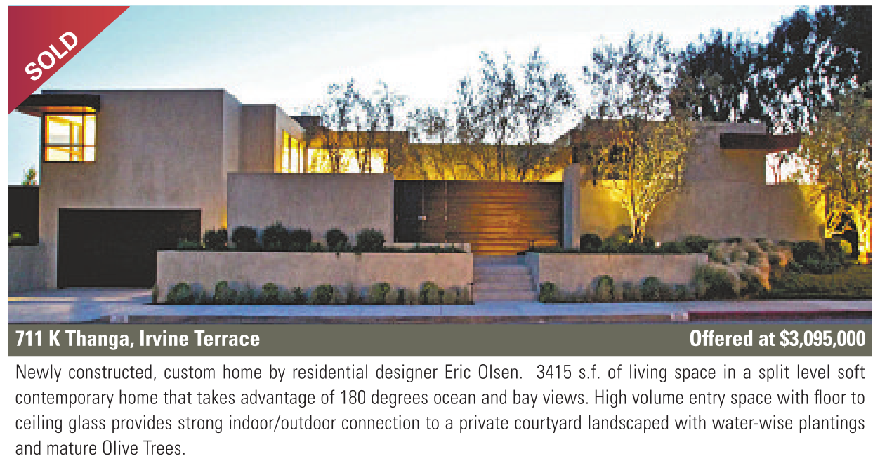 711 K Thanga, Irvine Terrace Offered at $3,095,000 Newly constructed, custom home by residential designer Eric Olsen. 3415 s.f. of living space in a split level soft contemporary home that takes advantage of 180 degrees ocean and bay views. High volume entry space with floor to ceiling glass provides strong indoor/outdoor connection to a private courtyard landscaped with water-wise plantings and mature Olive Trees.