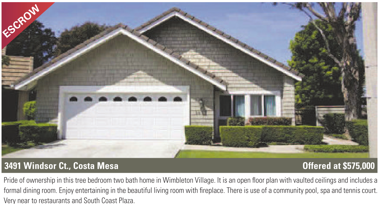3491 Windsor Ct., Costa Mesa Offered at $575,000 Pride of ownership in this tree bedroom two bath home in Wimbleton Village. It is an open floor plan with vaulted ceilings and includes a formal dining room. Enjoy entertaining in the beautiful living room with fireplace. There is use of acommunity pool, spa and tennis court. Very near to restaurants and South Coast Plaza.