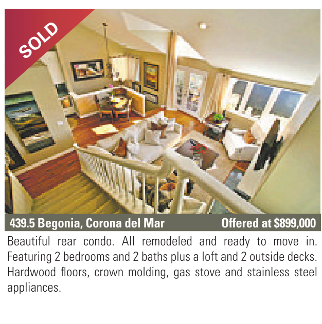 439.5 Begonia, Corona del Mar Offered at $899,000 Beautiful rear condo. All remodeled and ready to move in. Featuring 2 bedrooms and 2 baths plus a loft and 2 outside decks. Hardwood floors, crown molding, gas stove and stainless steel appliances.