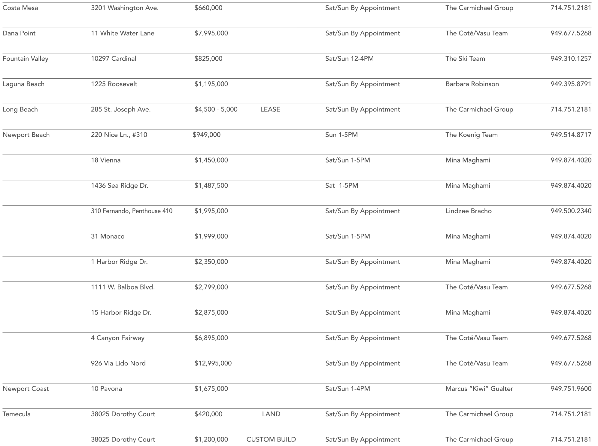 Newport Coast 10 Pavona $1,675,000 Sat/Sun 1-4PM Marcus “Kiwi” Gualter 949.751.9600