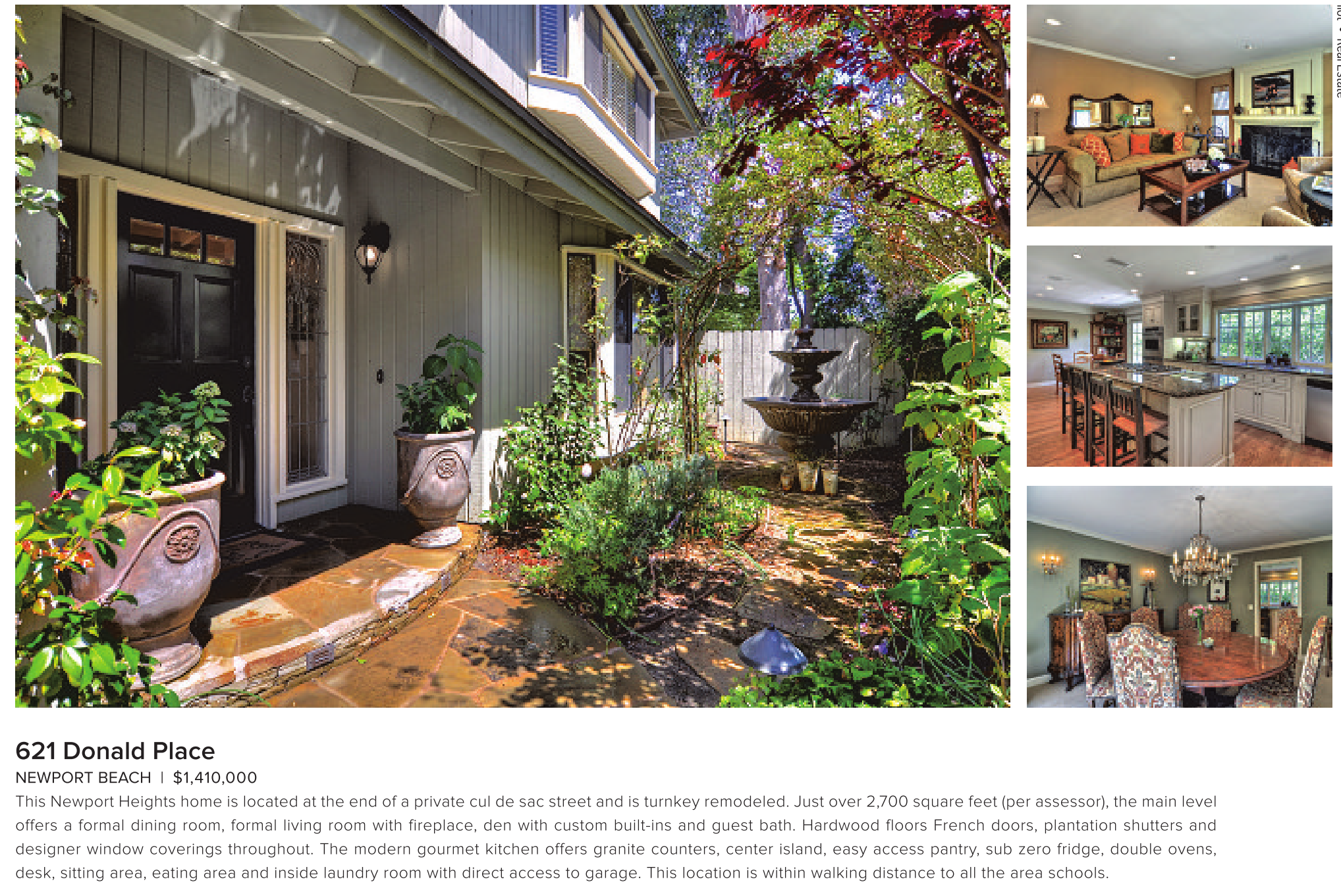 newport beach | $1,410,000 This Newport Heights home is located at the end of a private cul de sac street and is turnkey remodeled. Just over 2,700 square feet (per assessor), the main level offers a formal dining room, formal living room with fireplace, den with custom built-ins and guest bath. Hardwood floors French doors, plantation shutters and designer window coverings throughout. The modern gourmet kitchen offers granite counters, center island, easy access pantry, sub zero fridge, double ovens, desk, sitting area, eating area and inside laundry room with direct access to garage. This location is within walking distance to all the area schools.