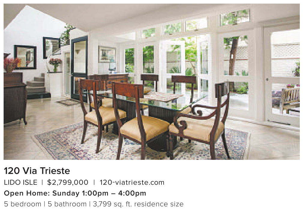 LIDO ISLE | $2,799,000 | 120-viatrieste.com Open Home: Sunday 1:00pm – 4:00pm 5 bedroom | 5 bathroom | 3,799 sq. ft. residence size