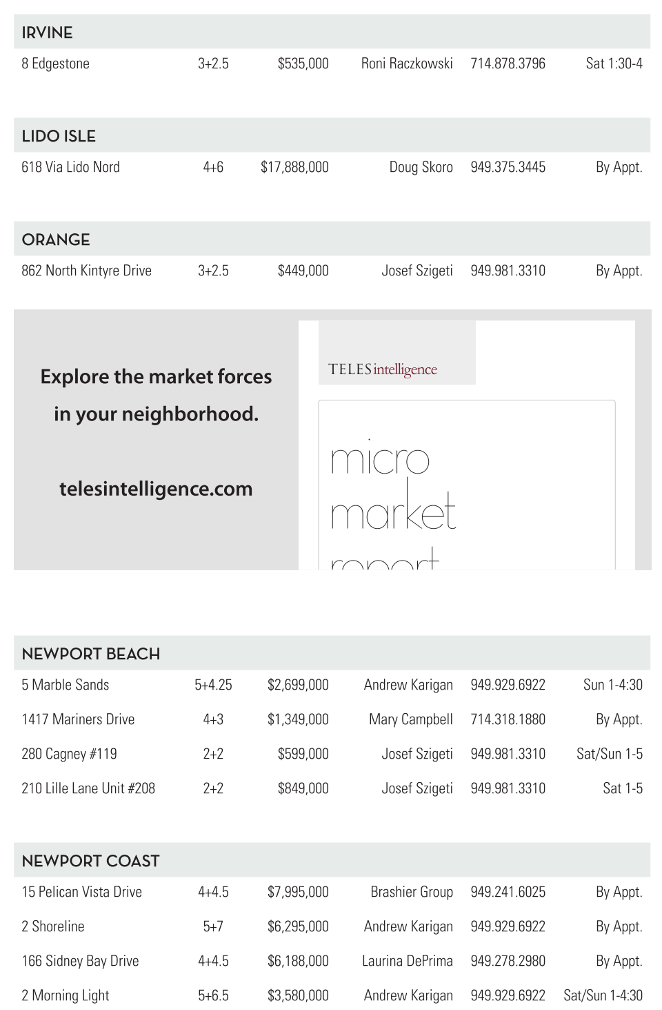 IRVINE 8Edgestone 3+2.5 $535,000 Roni Raczkowski 714.878.3796 Sat 1:30-4 LIdo IsLE 618 ViaLido Nord 4+6 $17,888,000 Doug Skoro 949.375.3445 By Appt. oRaNgE 862 North Kintyre Drive 3+2.5 $449,000 Josef Szigeti 949.981.3310 By Appt. Explore the market forces in your neighborhood. telesintelligence.com TELESintelligence micro market report NEwpoRtBEach 5Marble Sands 5+4.25 $2,699,000 Andrew Karigan 949.929.6922 Sun 1-4:30 1417 Mariners Drive 4+3 $1,349,000 Mary Campbell 714.318.1880 By Appt. 280 Cagney #119 2+2 $599,000 Josef Szigeti 949.981.3310 Sat/Sun 1-5 210 Lille Lane Unit #208 2+2 $849,000 Josef Szigeti 949.981.3310 Sat 1-5 NEwpoRtcoast 15 Pelican Vista Drive 4+4.5 $7,995,000 Brashier Group 949.241.6025 By Appt. 2Shoreline 5+7 $6,295,000 Andrew Karigan 949.929.6922 By Appt. 166 Sidney Bay Drive 4+4.5 $6,188,000 Laurina DePrima 949.278.2980 By Appt. 2Morning Light 5+6.5 $3,580,000 Andrew Karigan 949.929.6922 Sat/Sun 1-4:30 See also