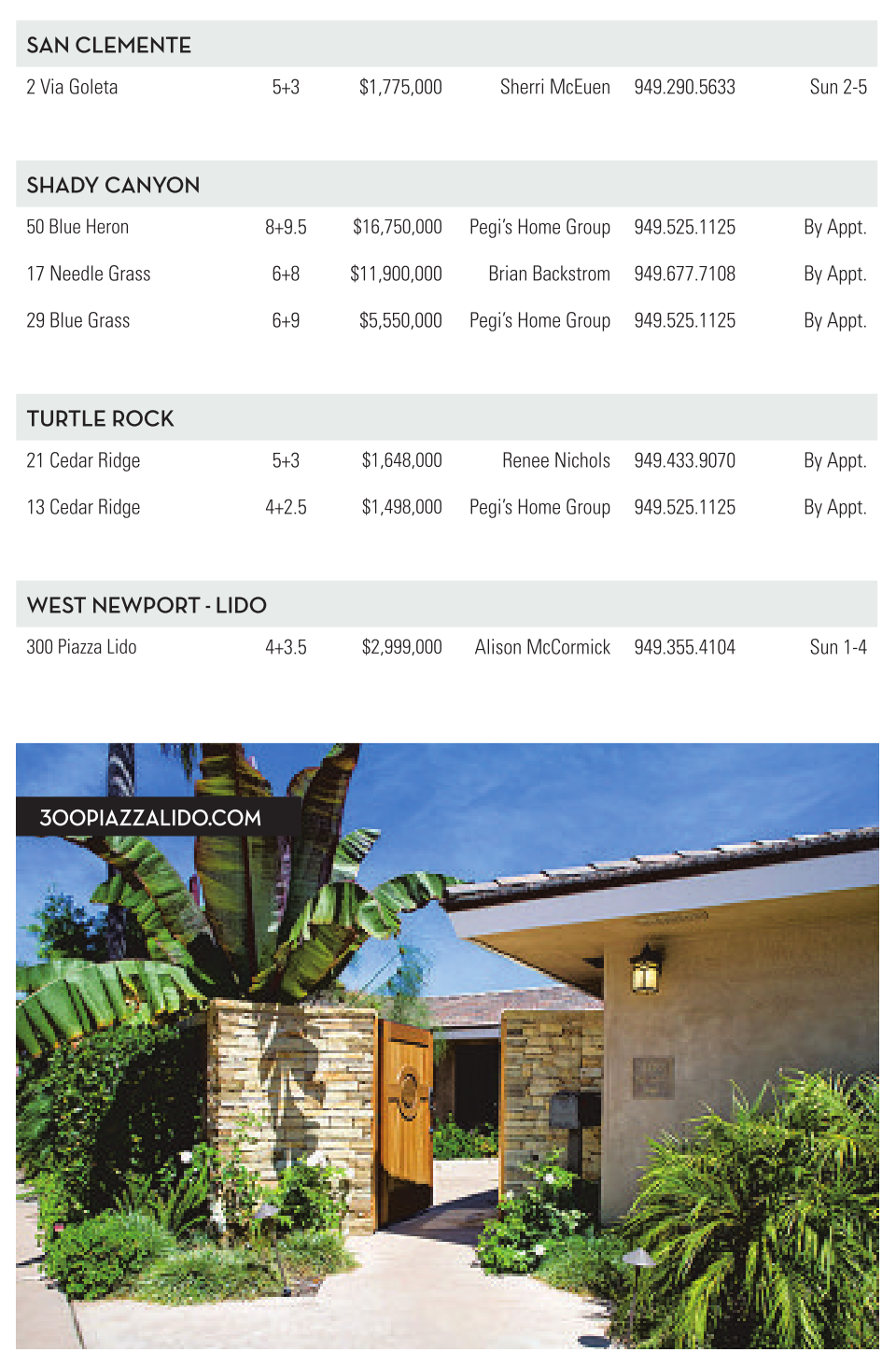 300 Piazza Lido 4+3.5 $2,999,000 Alison McCormick 949.355.4104 Sun 1-4