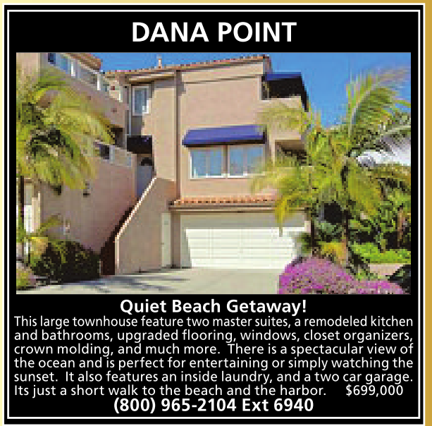 DANA POINT Quiet Beach Getaway! This largetownhousefeature twomastersuites, aremodeledkitchen andbathrooms,upgradedflooring, windows,closet organizers, crownmolding, andmuchmore. Thereisaspectacular viewof theocean andisperfect forentertainingorsimply watchingthe sunset. Italso features an insidelaundry,and atwo cargarage. Its just ashort walk to the beach and the harbor. $699,000 (800) 965-2104 Ext 6940 See also