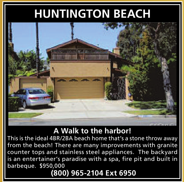 HUNTINGTON BEACH A Walk to the harbor! This is theideal 4BR/2BAbeach home that’sastone throw away from the beach! There are many improvements with granite counter tops and stainless steel appliances. The backyard is an entertainer’s paradise with a spa, fire pit and built in barbeque. $950,000 (800) 965-2104 Ext 6950 See also