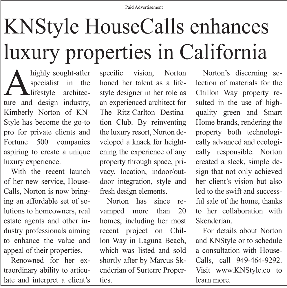 For details about Norton and KNStyle or to schedule a consultation with House- Calls, call 949-464-9292. Visit www.KNStyle.co to learn more.