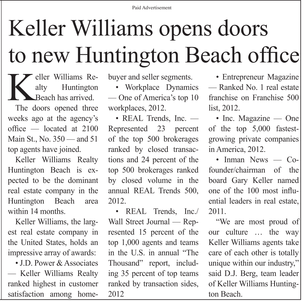 Keller Williams Realty Huntington Beach is expected to be the dominant real estate company in the Huntington Beach area within 14 months.