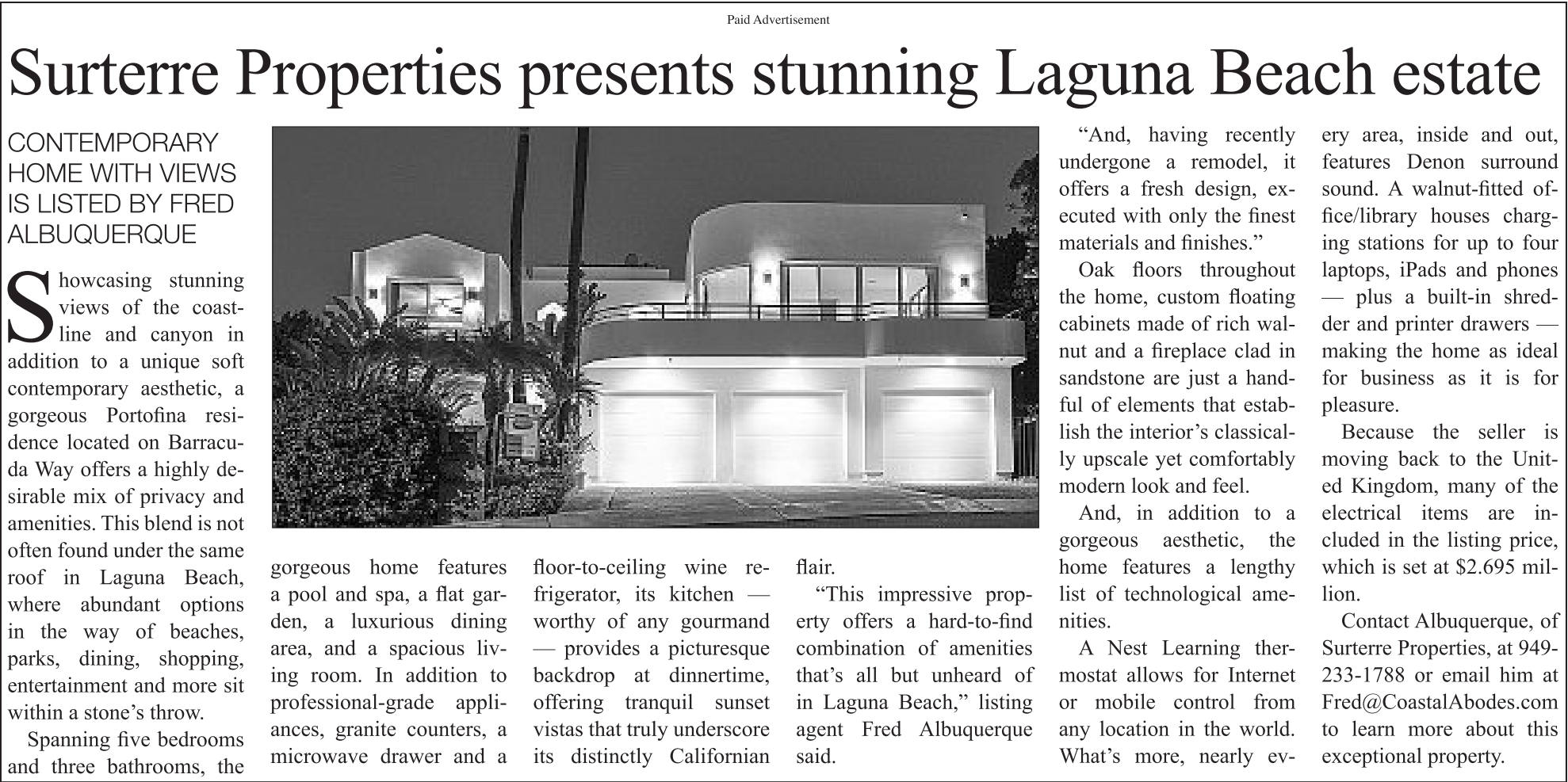 Contact Albuquerque, of Surterre Properties, at 949- 233-1788 or email him at Fred@CoastalAbodes.com to learn more about this exceptional property.
