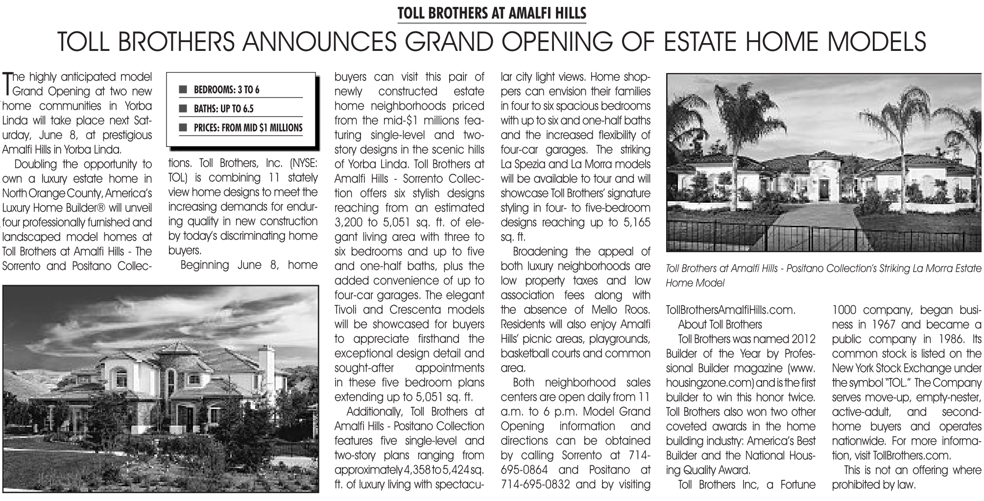 buyers can visit this pair of newly constructed estate home neighborhoods priced from the mid-$1 millions featuring single-level and twostory designs in the scenic hills of Yorba Linda. Toll Brothers at Amalfi Hills - Sorrento Collection offers six stylish designs reaching from an estimated 3,200 to 5,051 sq. ft. of elegant living area with three to six bedrooms and up to five and one-half baths, plus the added convenience of up to four-car garages. The elegant Tivoli and Crescenta models will be showcased for buyers to appreciate firsthand the exceptional design detail and sought-after appointments in these five bedroom plans extending up to 5,051 sq. ft.