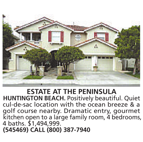 ESTATE AT THE PENINSULA HUNTINGTON BEACH. Positively beautiful. Quiet cul-de-sac location with the ocean breeze & a golf course nearby. Dramatic entry, gourmet kitchen open to alarge family room, 4bedrooms, 4 baths. $1,494,999. (545469) CALL (800) 387-7940