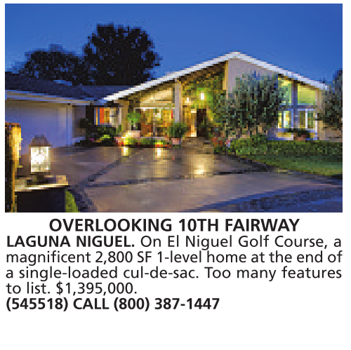 OVERLOOKING 10TH FAIRWAY LAGUNA NIGUEL. On El Niguel Golf Course, a magnificent 2,800 SF 1-level home at the end of a single-loaded cul-de-sac. Too many features to list. $1,395,000. (545518) CALL (800) 387-1447