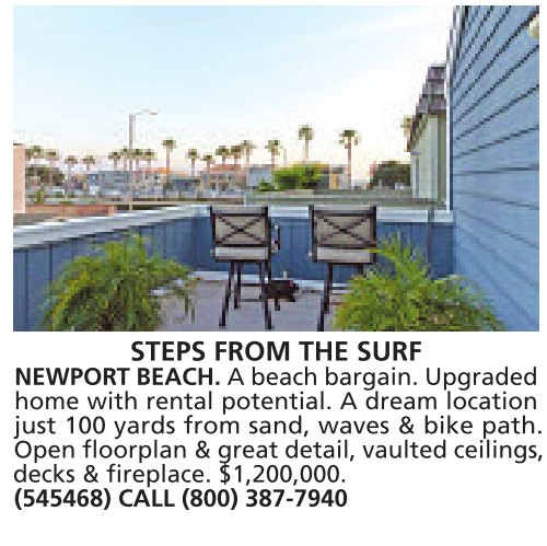 STEPS FROM THE SURF NEWPORTBEACH. Abeach bargain. Upgraded home with rental potential. A dream location just 100 yards from sand, waves & bike path. Open floorplan & great detail, vaulted ceilings, decks & fireplace. $1,200,000. (545468) CALL (800) 387-7940