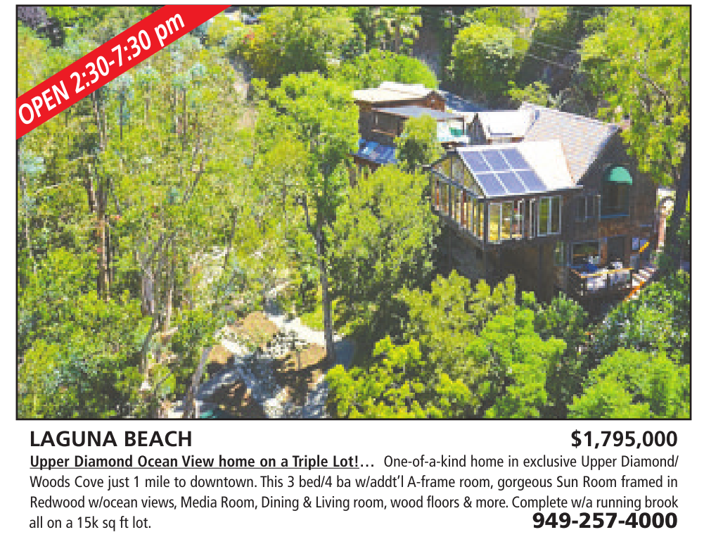 LAGUNA BEACH $1,795,000 Upper Diamond Ocean View home on aTriple Lot!… One-of-a-kind home in exclusive Upper Diamond/ Woods Cove just 1 mile to downtown. This 3 bed/4 ba w/addt’l A-frame room, gorgeous Sun Room framed in Redwoodw/ocean views,Media Room, Dining &Living room, wood floors &more.Complete w/a running brook allona15k sq ft lot. 949-257-4000