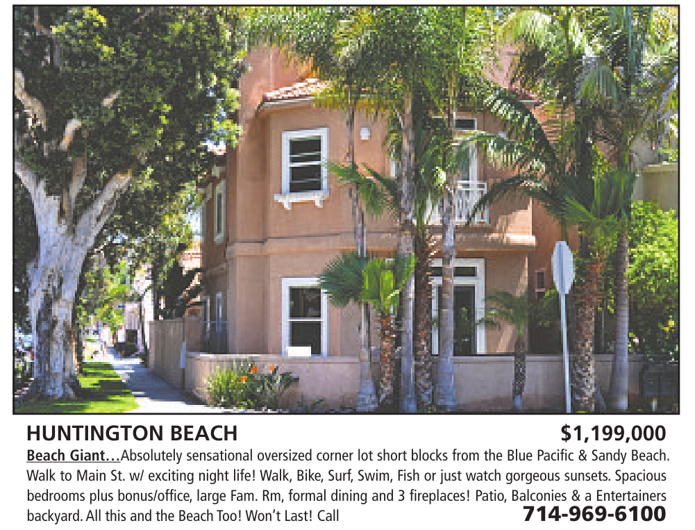 HUNTINGTON BEACH $1,199,000 Beach Giant…Absolutely sensational oversized corner lot short blocks from the Blue Pacific & Sandy Beach. Walk to Main St. w/ exciting night life! Walk, Bike, Surf,Swim, Fish or just watch gorgeous sunsets.Spacious bedrooms plus bonus/office,large Fam. Rm, formal dining and 3 fireplaces! Patio,Balconies & a Entertainers backyard.All this and the Beach Too! Won’t Last! Call 714-969-6100