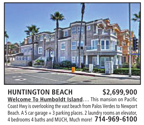 HUNTINGTON BEACH $2,699,900 Welcome To Humboldt Island… This mansion onPacific CoastHwy is overlooking thevastbeachfrom PalosVerdes to Newport Beach.A5car garage+3parking places. 2laundry roomsanelevator, 4bedrooms 4baths andMUCH, Much more! 714-969-6100