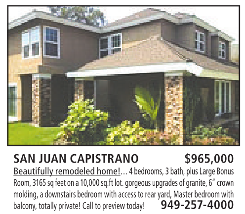 SAN JUAN CAPISTRANO $965,000 Beautifullyremodeledhome!… 4bedrooms,3bath, plus Large Bonus Room,3165sqfeetona10,000 sq.ft lot. gorgeous upgrades of granite,6”crown molding,adownstairsbedroomwithaccess to rear yard,Master bedroomwith balcony,totally private!Calltopreview today! 949-257-4000