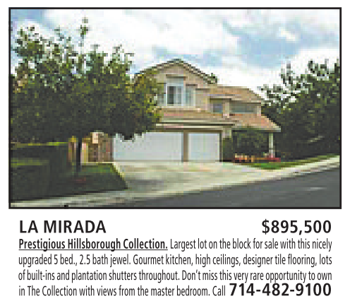 LA MIRADA $895,500 Prestigious HillsboroughCollection. Largest lotonthe blockfor sale with this nicely upgraded 5bed.,2.5 bath jewel. Gourmet kitchen,highceilings,designer tile flooring,lots of built-ins andplantationshuttersthroughout.Don’t missthis very rare opportunitytoown in TheCollectionwithviews from themaster bedroom. Call 714-482-9100