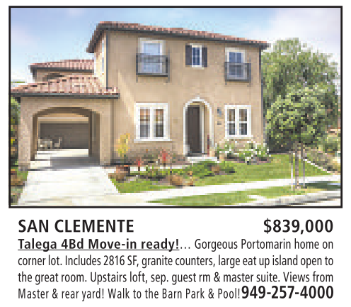 SAN CLEMENTE $839,000 Talega 4Bd Move-in ready!… Gorgeous Portomarin home on corner lot. Includes 2816 SF,granite counters, large eat up island opento thegreat room. Upstairsloft, sep. guestrm&mastersuite. Viewsfrom Master &rearyard! Walk to the BarnPark&Pool!949-257-4000