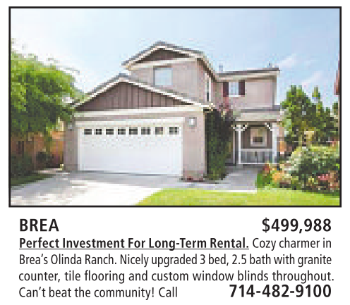 BarnPark&Pool!949-257-4000 BREA $499,988 PerfectInvestmentFor Long-Term Rental. Cozy charmer in Brea’s Olinda Ranch. Nicelyupgraded 3bed,2.5 bath with granite counter, tile flooring and custom window blinds throughout. Can’tbeat thecommunity!Call 714-482-9100