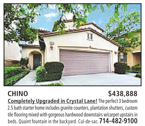 Can’tbeat thecommunity!Call CHINO $438,888 Completely UpgradedinCrystal Lane! Theperfect 3bedroom 2.5bathstarter home includes granite counters, plantation shutters,custom tile flooring mixedwithgorgeous hardwood downstairsw/carpetupstairsin beds. Quaint fountain in the backyard. Cul-de-sac.714-482-9100