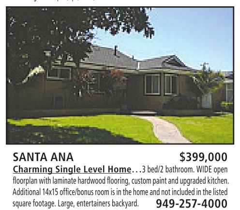 like setting includes pool, spa, sauna, clubhouseand more.Call 714-969-6100 SANTA ANA $399,000 Charming Single Level Home…3 bed/2 bathroom. WIDE open floorplanwithlaminatehardwood flooring,custompaintand upgraded kitchen. Additional 14x15office/bonus room is in thehome andnot included in thelisted squarefootage.Large,entertainersbackyard. 949-257-4000