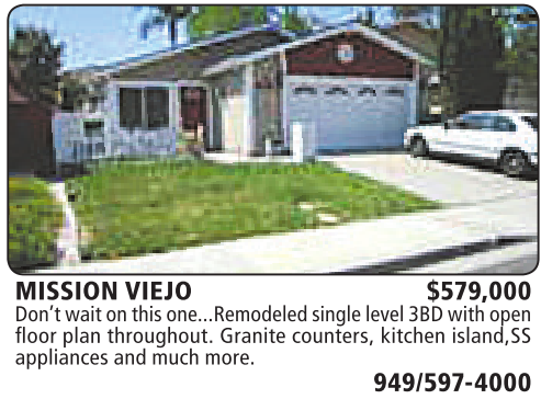 MISSION VIEJO $579,000 Don’twaitonthis one...Remodeledsinglelevel 3BDwithopen floor plan throughout. Granite counters, kitchen island,SS appliances andmuchmore.