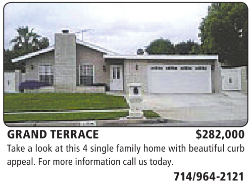 GRAND TERRACE $282,000 Take alook atthis 4single family home with beautiful curb appeal. Formore informationcallustoday.