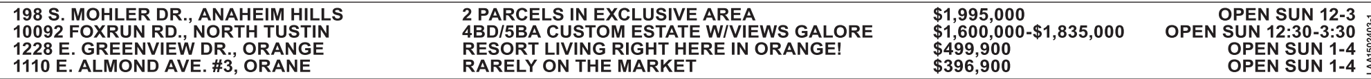 198 S. MOHLER DR., ANAHEIM HILLS 2 PARCELS IN EXCLUSIVE AREA $1,995,000 OPEN SUN 12-3 10092 FOXRUN RD., NORTH TUSTIN 4BD/5BA CUSTOM ESTATE W/VIEWS GALORE $1,600,000-$1,835,000 OPEN SUN 12:30-3:30 1228 E. GREENVIEW DR., ORANGE RESORT LIVING RIGHT HERE IN ORANGE! $499,900 OPEN SUN 1-4 1110 E. ALMOND AVE. #3, ORANE RARELY ON THE MARKET $396,900 OPEN SUN 1-4