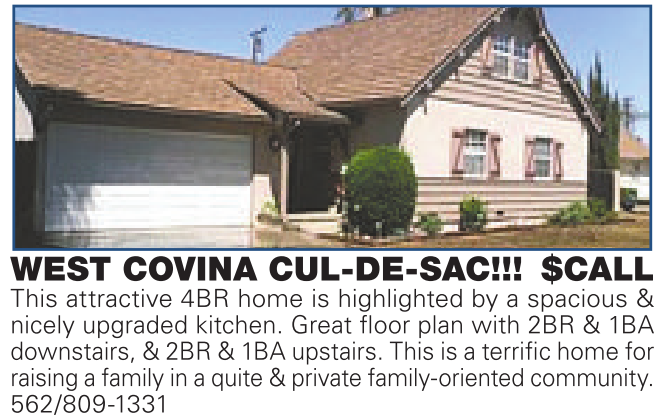 WEST COVINA CUL-DE-SAC!!! $CALL This attractive 4BR home is highlighted by a spacious & nicely upgraded kitchen. Great floor plan with 2BR & 1BA downstairs, & 2BR & 1BA upstairs. This is a terrific home for raising a family in a quite & private family-oriented community. 562/809-1331