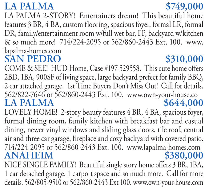 LA PALMA $749,000 LA PALMA 2-STORY! Entertainers dream! This beautiful home features 3BR, 4BA, custom flooring,spaciousfoyer,formalLR, formal DR,family/entertainmentroomw/fullwet bar, FP,backyardw/kitchen & so much more! 714/224-2095 or 562/860-2443 Ext. 100. www. lapalma-homes.com SAN PEDRO $310,000 COME &SEE! HUD Home,Case#197-529558. Thiscutehomeoffers 2BD, 1BA, 900SFoflivingspace,large backyard prefectfor family BBQ, 2car attached garage. 1st Time BuyersDon’t Miss Out! Call fordetails. 562/822-7646 or 562/860-2443 Ext. 100. www.own-your-house.co LA PALMA $644,000 LOVELY HOME! 2-storybeautyfeatures 4BR, 4BA, spacious foyer, formal dining room, family kitchen with breakfast bar and casual dining, newer vinyl windows and sliding glass doors, tile roof, central airand threecar garage, fireplaceand cozy backyard with coveredpatio. 714/224-2095 or 562/860-2443 Ext. 100. www.lapalma-homes.com ANAHEIM $380,000 NICE SINGLE FAMILY! Beautiful single storyhomeoffers3BR, 1BA, 1car detached garage, 1carport spaceand so much more. Callfor more details. 562/805-9510 or 562/860-2443 Ext100.www.own-your-house.com