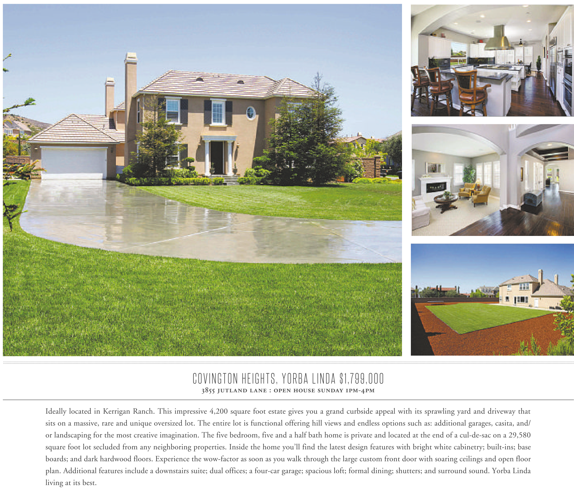 COVINGTON HEIGHTS, YORBA LINDA $1,799,000 3855 jutland lane : open house sunday 1pm-4pm Ideally located in Kerrigan Ranch. This impressive 4,200 square foot estate gives you a grand curbside appeal with its sprawling yard and driveway that sits on a massive, rare and unique oversized lot. The entire lot is functional offering hill views and endless options such as: additional garages, casita, and/ or landscaping for the most creative imagination. The five bedroom, five and a half bath home is private and located at the end of a cul-de-sac on a 29,580 square foot lot secluded from any neighboring properties. Inside the home you’ll find the latest design features with bright white cabinetry; built-ins; base boards; and dark hardwood floors. Experience the wow-factor as soon as you walk through the large custom front door with soaring ceilings and open floor plan. Additional features include a downstairs suite; dual offices; a four-car garage; spacious loft; formal dining; shutters; and surround sound. Yorba Linda living at its best.