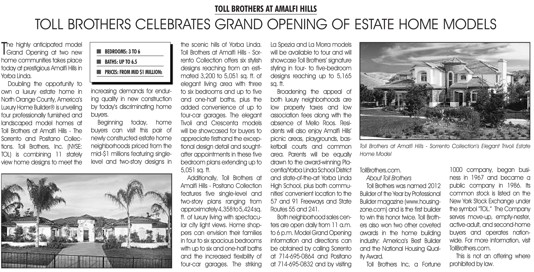 doubling the opportunity to own a luxury estate home in North Orange County, America’s luxury Home Builder® is unveiling four professionally furnished and landscaped model homes at Toll Brothers at Amalfi Hills - The sorrento and Positano Collections. Toll Brothers, inc. (NYsE: