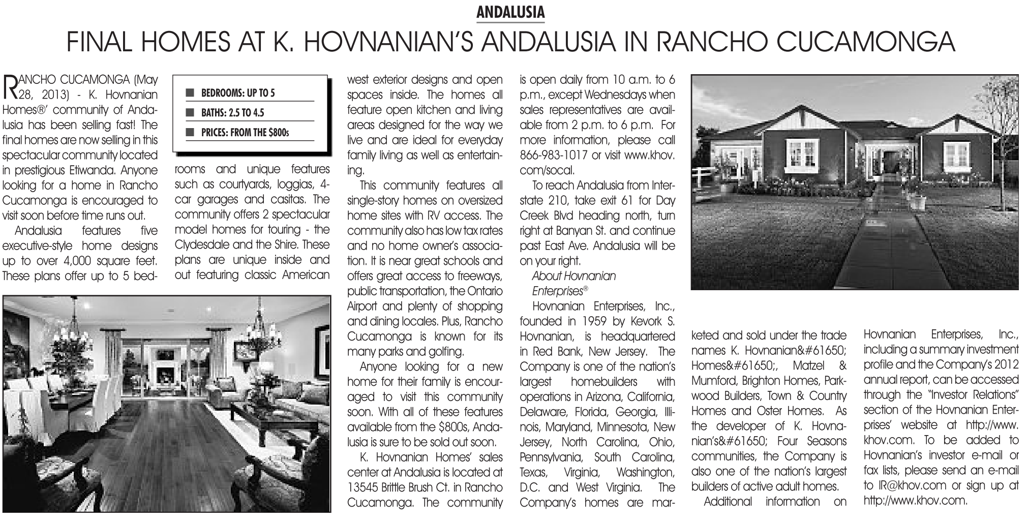 CUCAMONGA (May 28, 2013) - K. Hovnanian Homes®’ community of Andalusia has been selling fast! The final homes are now selling in this spectacular community located in prestigious Etiwanda. Anyone looking for a home in Rancho Cucamonga is encouraged to visit soon before time runs out.
